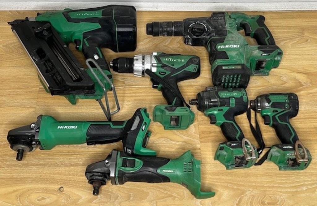 Cordless Hikoki Hitachi tools. 1 x NR1890DBCL strip nailer 18V, 1 x WH 36DC impact driver 36V, 1 x DV 18DSDL hammer drill 18V, 1 x DH 3628DC rotary hammer drill 36V, 1 x WR 36DH impact wrench 36V, 1 x G 18DSL2 angle grinder 18V, 1 x G 3613DVF angle grinder 36V. Skins only, no batteries. Condition: Not working, untested, for parts or repair.