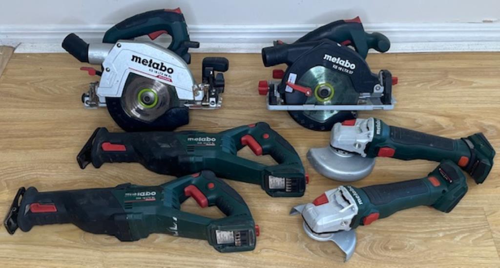 Cordless Metabo tools. 2 x SSE 18 LTX BL reciprocating saws, 1 x KS 18 LTX 57 circular saw, 1 x KS 18 LTX 66 BL circular saw, 2 x WB 18 LTX BL 11-125 quick angle grinders. Skins only, no batteries. Condition: Not working, untested, for parts or repair.