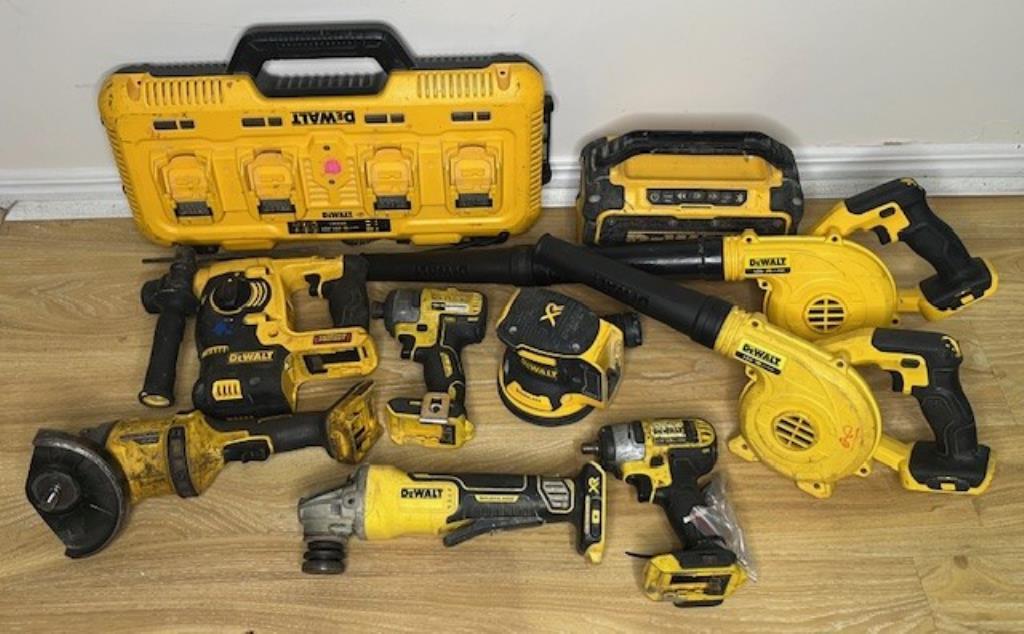 Cordless DeWalt 18V tools. 1 x DCH253 rotary hammer drill, 2 x DCV100-XE mini blowers, 1 x DCF885-XE impact driver, 1 x DCF887-XE impact driver, 1 x DCR011 bluetooth radio, 1 x angle grinder, 1 x DCG418 angle grinder, 1 x orbital sander, 1 x DCB104 4 port charger. Skins only, no batteries. Condition: Not working, untested, for parts or repair.
