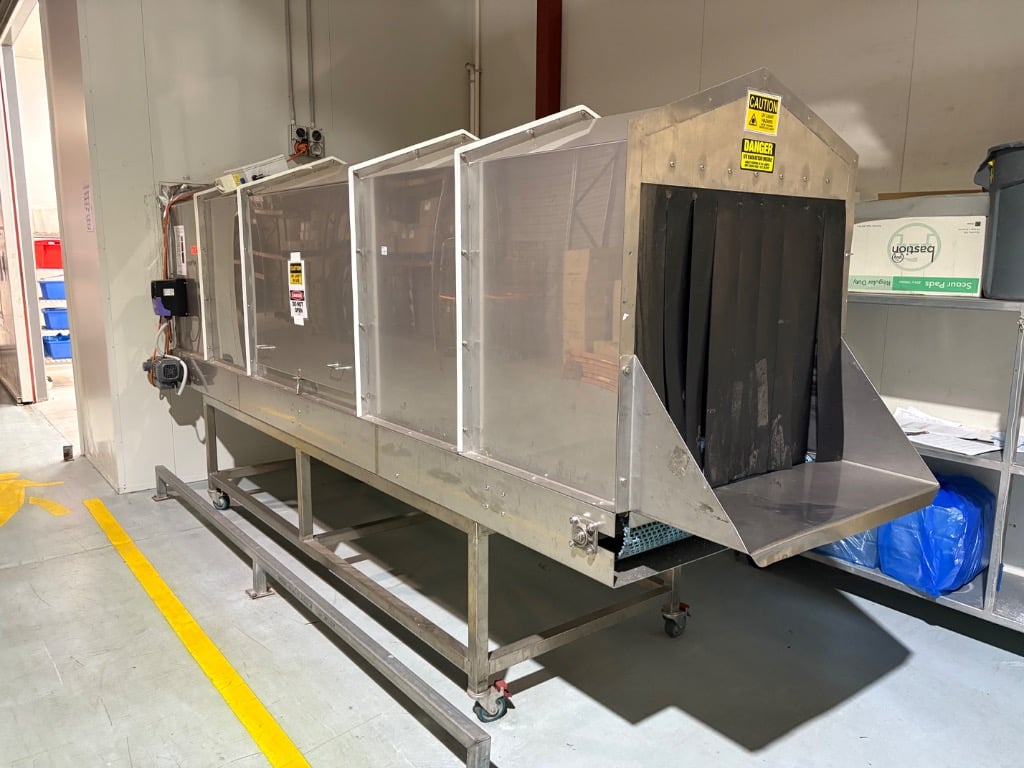 • A UV sanitation / disinfection tunnel designed to treat surfaces of products (or packaging) by exposing them to UV-C light as they pass through on a conveyor belt.