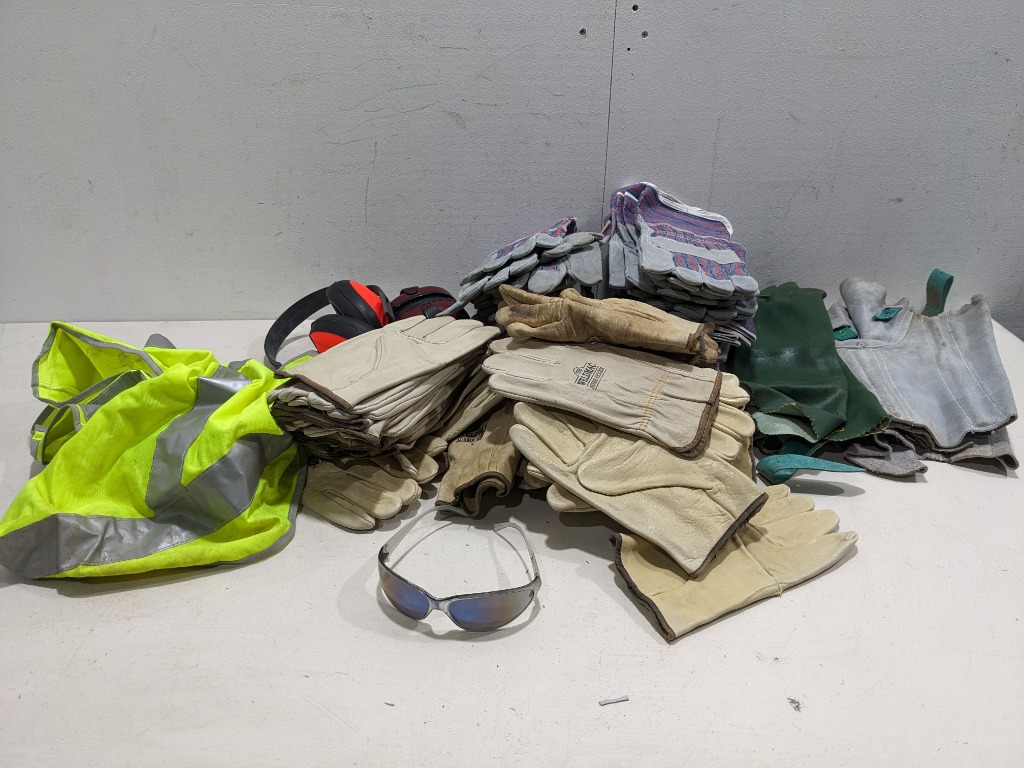 Assorted items, safety gloves, gardening gloves and more... Note: sings of ware. Sold as a lot.