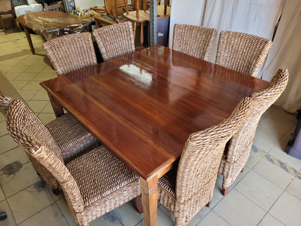 8 Seater Dining Table, Timber Style Dark Brown Finish, Rattan ChairsDimensions Chairs H:107cm W:53cm D:50cmDimensions Table H:80cm W:150cm D:150cmSOLD AS LOT