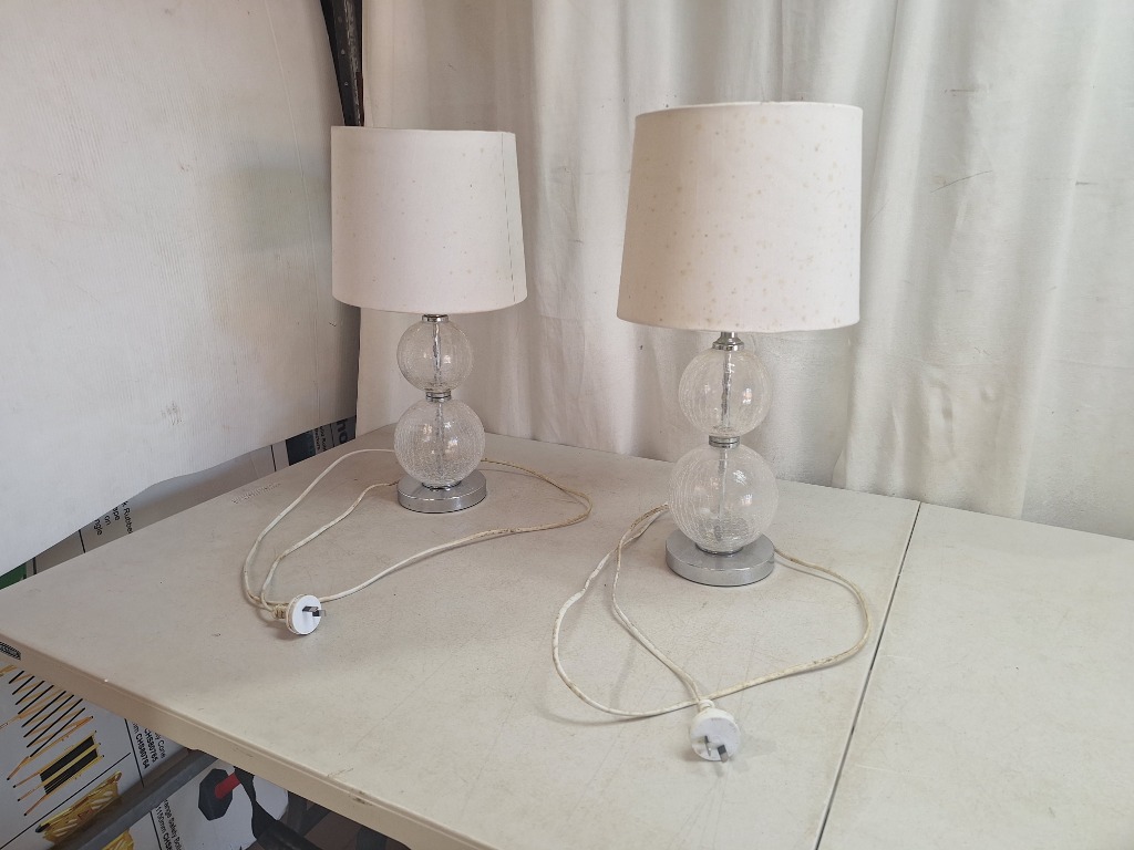2 x Nightstand lamps, Beige finish shade, Metal base.Dimensions: H 51cm x W 26cm x D 26cm.SOLD AS A PAIR.