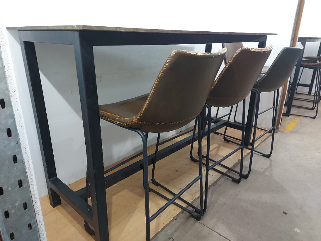 Standing Bar table With Timber Top Metal Legs, And 3x Brown and 1x Dark Grey Leather Style Bar Seats With Black Metal FrameStanding Bar Table Dimensions: 108mH x 180cmW 72cmDNOTE Scratches Marks Rust And Pealing See Photos For More