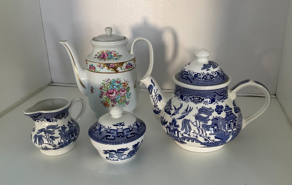 Churchill Blue Willow Ware teapot, creamer and covered sugar bowl, teapot height 19cm together with an Italian porcelain DEPOS floral gold trim design coffee pot, height 22cm