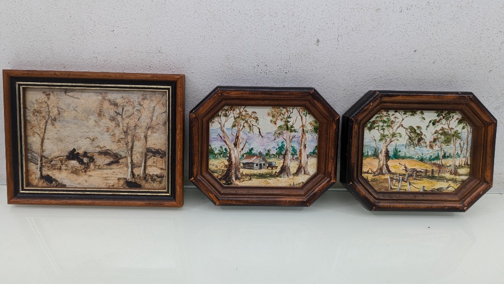 Art Work, Phyll Holmes Original Oil on Canvas 1992 Timber Frame Dimensions 11.5cm(H)×14cm(W)×2cm(D) Quantity 2 Judith Holt Paper Bark on Board Timber Frame Dimensions 13cm(H)×16.5cm(W)×1.5cm(D) Sold As Lot