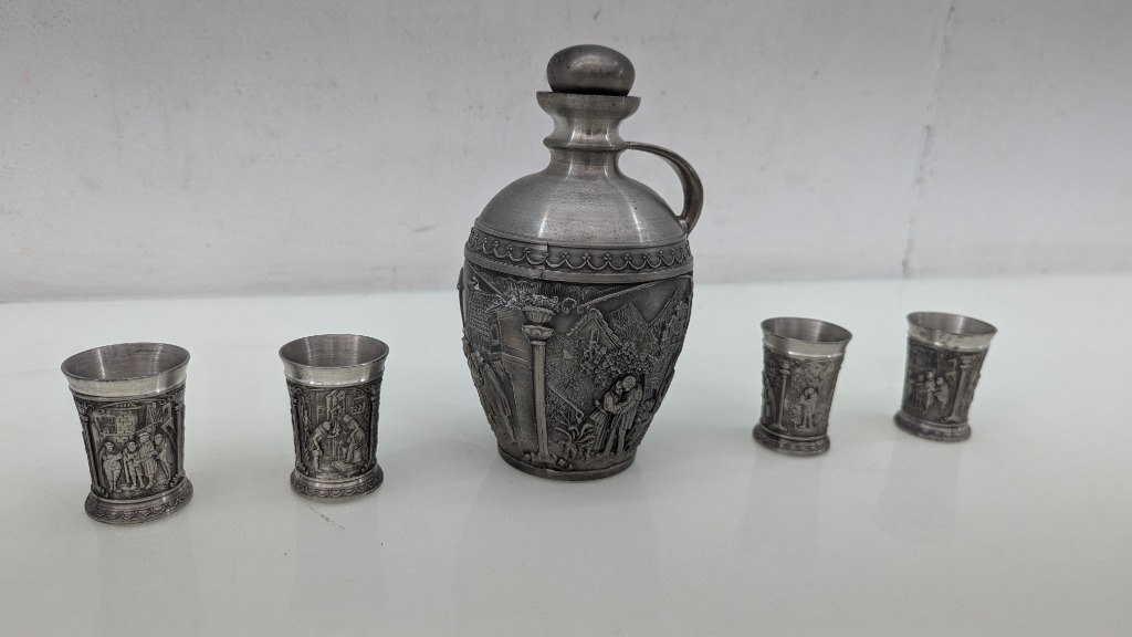 SKS Zinn 95% Pewter Decanter with Cork Stopper, Four Shot Glasses with Same Design