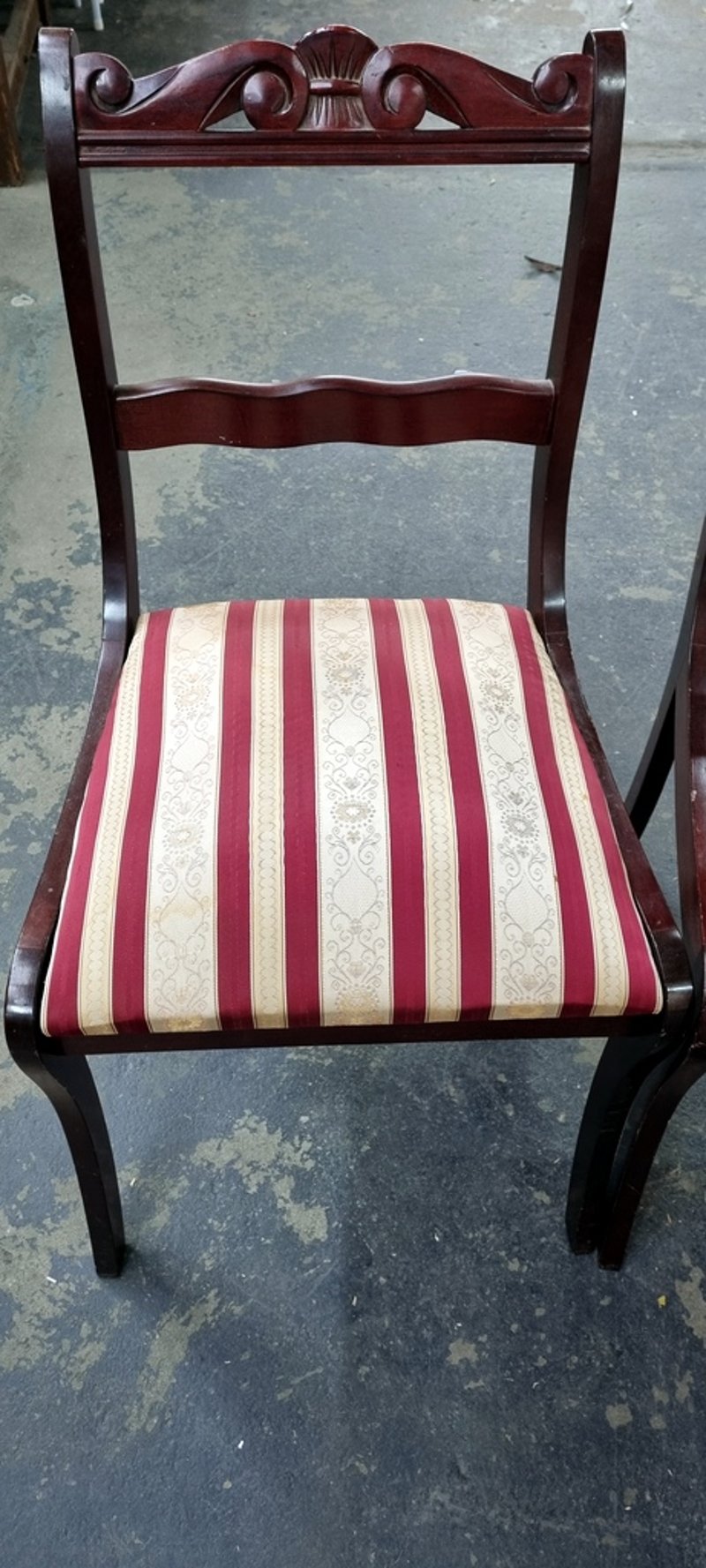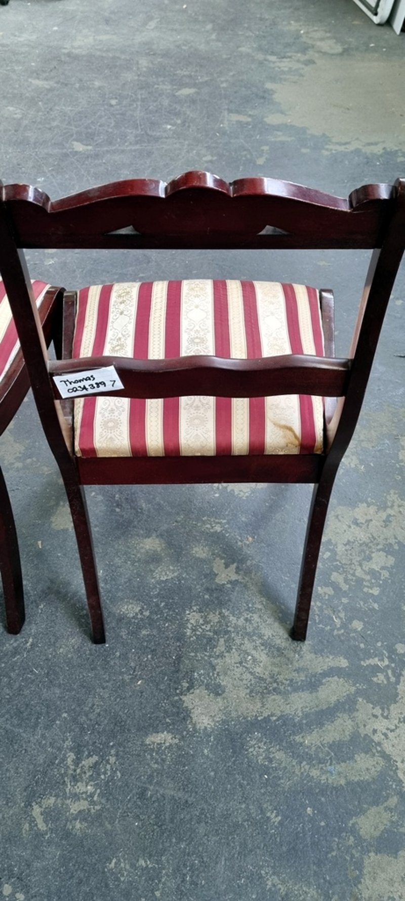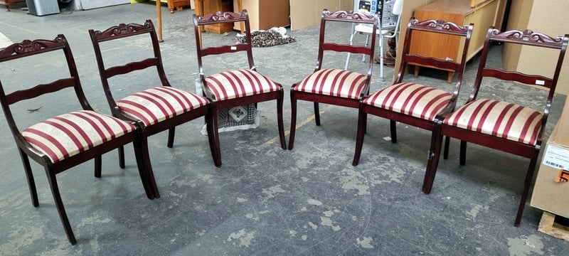 Chairs, 6 x timber style dining chairs Note: some chairs require seat cushion reattached to chair Sold as lot