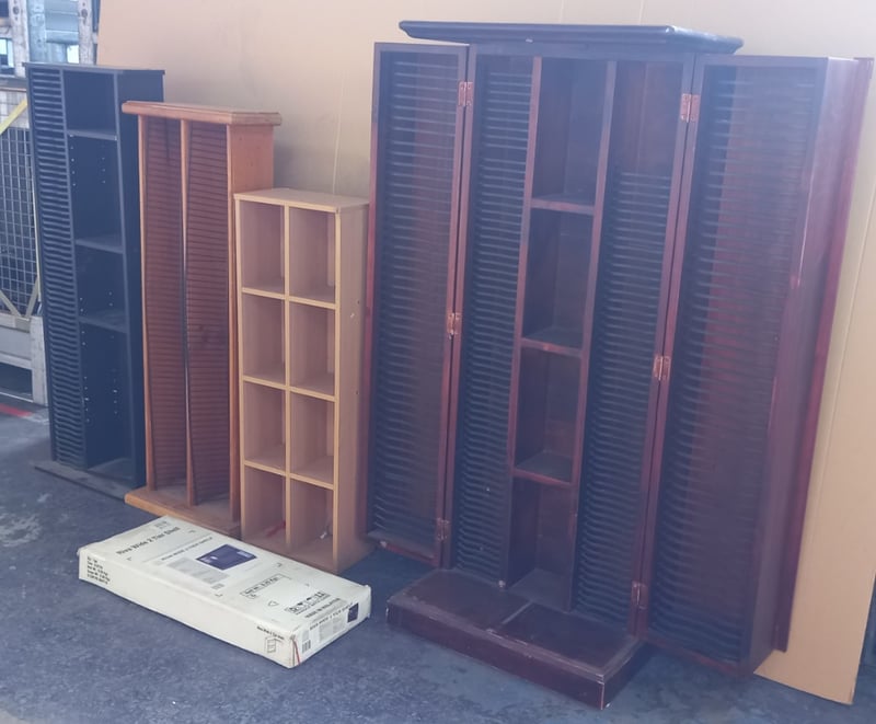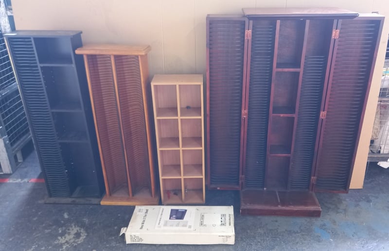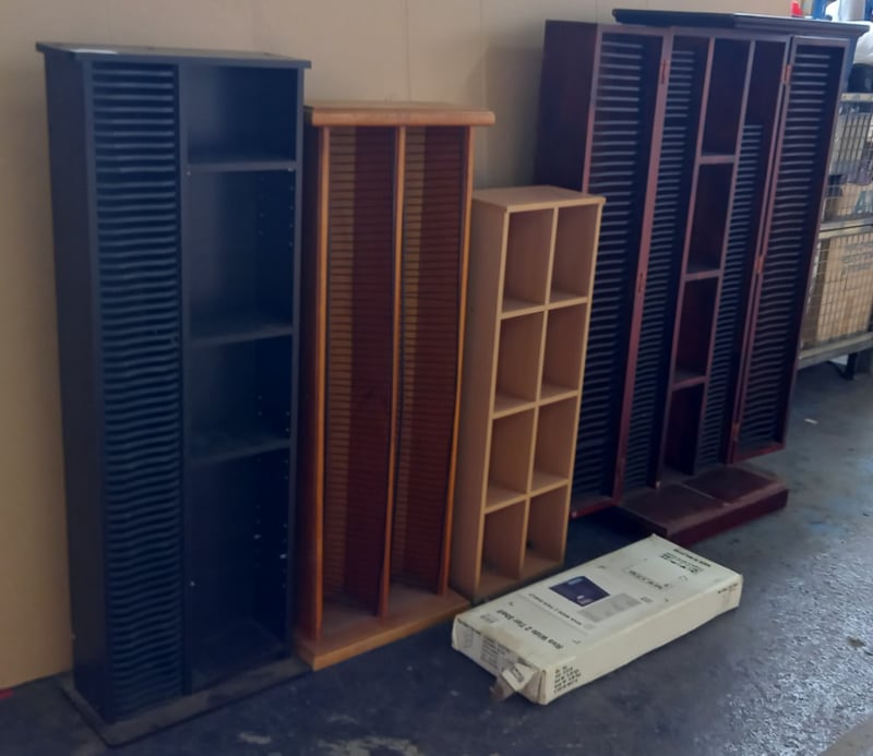 Furniture, assorted items including Timber Style shelves, and CD Racks Sold as lot