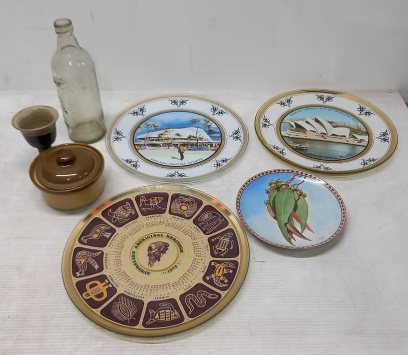 Australian souvenir plates & pottery, includes pottery such as cups and ceramic crocks, vintage plates and more Sold as lot