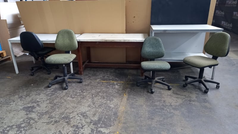 Tables, 3 x assorted tables, dimensions Largest180cm H x 120cm W x 80cm D, also includes 4 x office chairsSold as lot