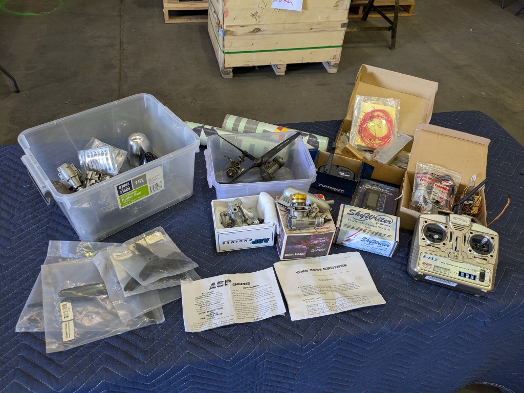 Radio Control Hobby Aircraft, Assorted Lot, Petrol Engines, Landing Gear System, Electric Ignition, Digital Proportional Radio Controller, Sky Writer Electronic Smoke System, Assorted Propellers, 8s Battery Capacity Merer, US Air Force Decals Plus Box of Used Engines & Propeller Cones,Fair Condition In Box, Onsite Inspection Recommended Refer To Images Note:UntestedSold as Lot