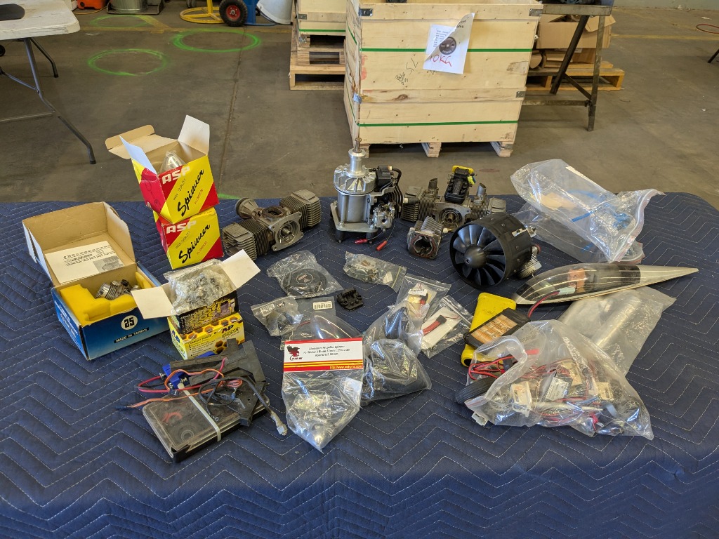 Radio Control Hobby Aircraft, Assorted Lot, Petrol Engines, Large & Small,, Turbine Jet Engine, Landing Gear System, Assorted Propeller Cones, Fuel Tanks, Cockpit with Pilot, Batteries, Receivers, Exhaust Pipe Fair Condition In Box, Onsite Inspection Recommended Refer To Images Note:UntestedSold as Lot