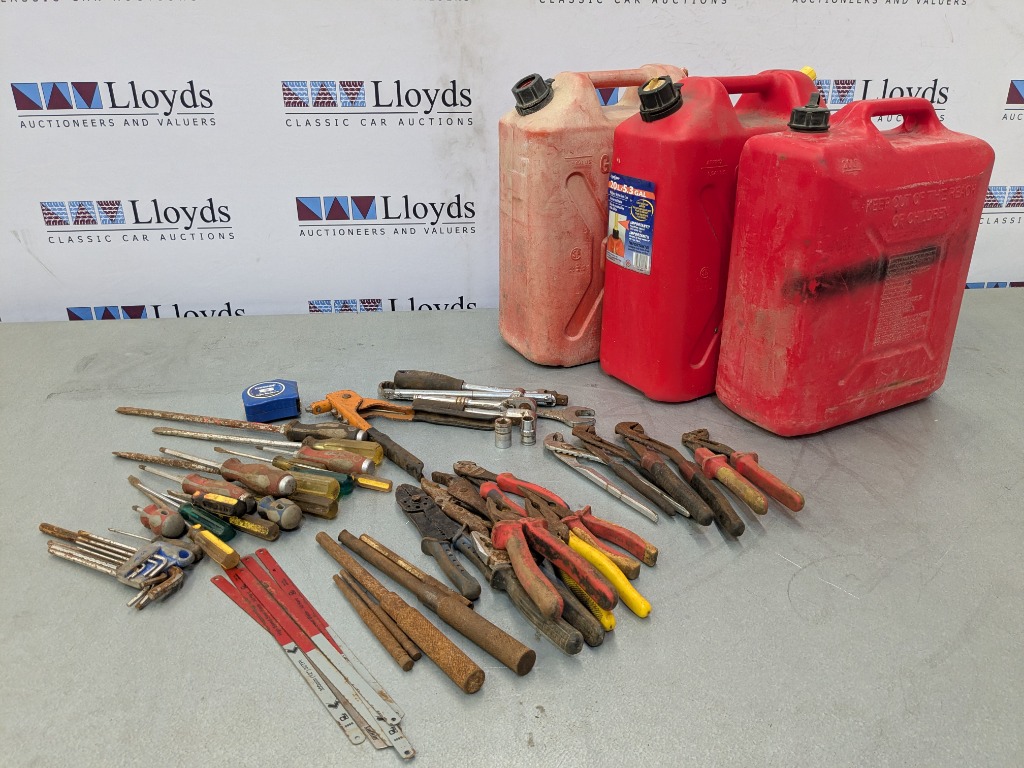 Assorted Hand Tools & Jerry Cans / Fuel Cans, Including Spanners, Screwdrivers, Metal Punches, Pliers, Metal Saw Blades, Rivet Gun & Measuring Tape Qty: Approximately 35 Items Sold as Lot