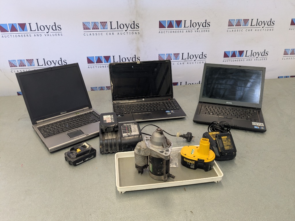 Parts Only, Assorted Electrical Items, Makita DC18SD Charger with 2 Makita 18 volt Li-ion Batteries, DeWalt DCB100 XE Charger with 1 DCB120 XE Battery, Toyota Hilux 2011 Starter Motor, DeWalt XRP 14.4 volt Battery, & HP, Dell, Toshiba LaptopsNote: UntestedSold as Lot