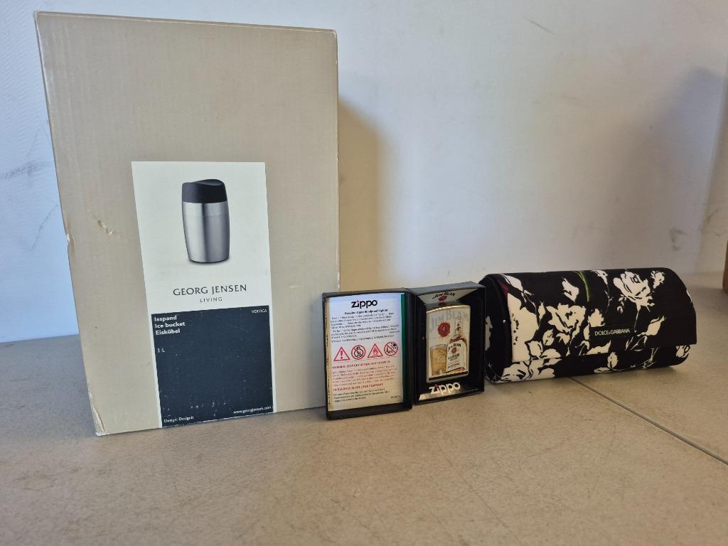 1 x GEORG JENSEN, Isspand ice bucket, 1 Litre, NEW in box, 1 x ZIPPO "Jim Beam" lighter, NEW in box, 1 x DOLCE & GABBANA ladies sunglasses, DG4267, pink frames, black frames,made in Italy, in case with cleaning cloth