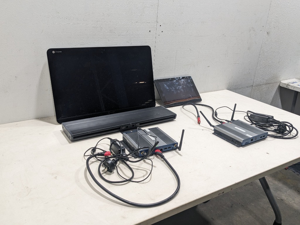 Google Chromecast screen 10', power cable included Model number: WT10M-FRG Dims: (Screen 10') H: 18cm x W: 30cm x D: 1cm Google Chromecast screen 25', power cable included Dims: (Screen 25') H: 32cm x W: 60cm x D: 2cm Sold as lot Note: Untasted and signs of wear and tear