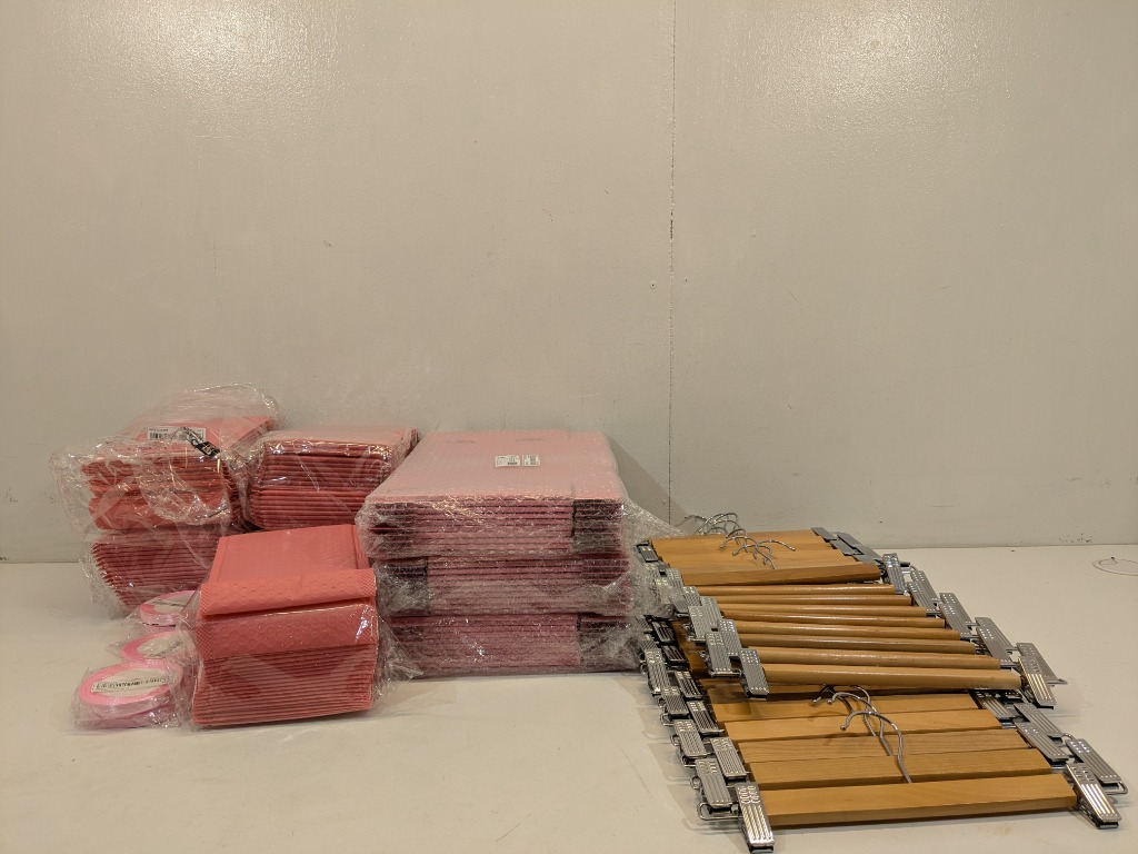 Assorted Lot of Shipping Satchels/Boxes and Stackable Clothing Hangers