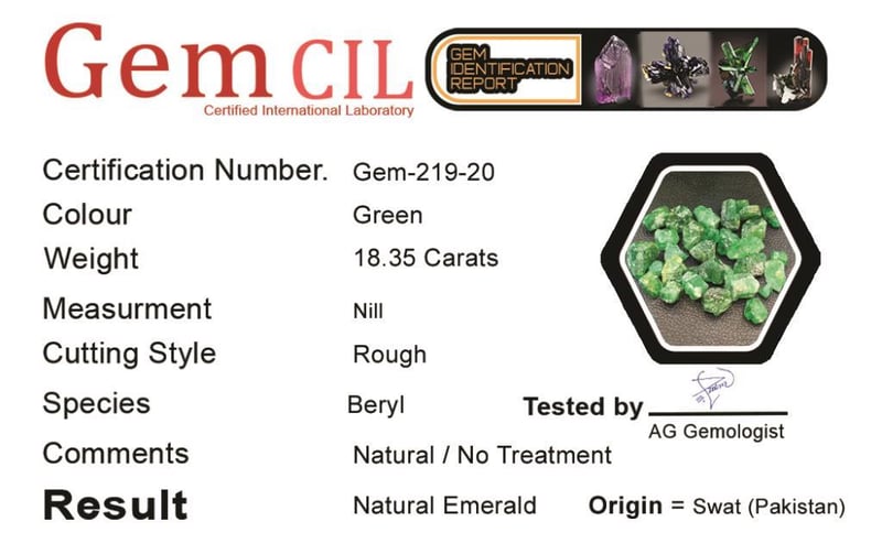 18.35 CARATS NATURAL EMERALD ROUGH SPECIMEN 18.35 Carats Natural Emerald Rough Specimen Stone = Natural Emerald Weight = 18.35 Carats Colour = Rich Green Cut = Rough Treatment = No Oil (Natural) Origin = Swat (Pakistan) Note = Gem Cil, Certified Condition: Good 645399+20