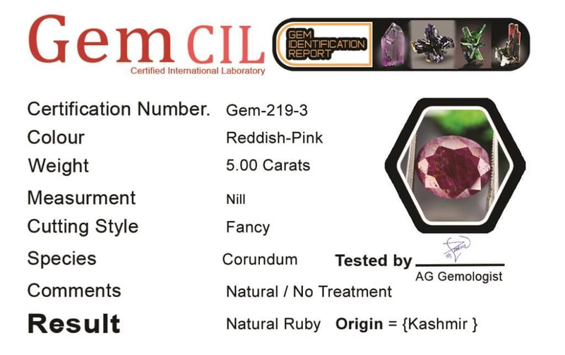 5.00 CARATS NATURAL KASHMIR CORUNDUM {RUBY / SAPPHIRE} 5.00 Carats Natural Kashmir Corundum {Ruby / Sapphire} Stone = Ruby Weight = 5.00 Carats Treatment = Natural-No Treatment Colour = Reddish-Pink Cut = Fancy Note = Gem Cil, Certified, Precise Custom Cut (Not Commercial) Condition: Good 645399+3