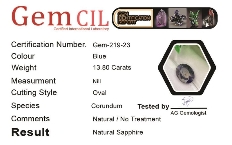 13.80 CARATS NATURAL CERTIFIED SAPPHIRE 13.80 Carats Natural Certified Sapphire Stone = Natural SapphireWeight = 13.80 Carats Cut = Oval Colour = BlueLustre = ExcellentTreatment = Natural (No Treatment Detected) Note = Gem Cil, Certified, Precise Custom Cut (Not Commercial) Condition: Good645399+23