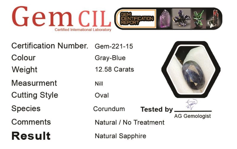 12.58 CARATS NATURAL CERTIFIED SAPPHIRE 12.58 Carats Natural Certified Sapphire Stone = Natural SapphireWeight = 12.58 Carats Cut = Oval Colour = GrayLustre = ExcellentTreatment = Natural (No Treatment Detected) Note = Gem Cil, Certified, Precise Custom Cut (Not Commercial) Condition: Good 0+115