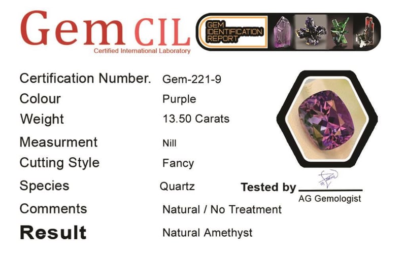 13.50 CARATS NATURAL QUALITY BRAZILIAN AMETHYST 13.50 Carats Natural Quality Brazilian AmethystStone = Natural AmethystWeight = 13.50 CaratsColour = PurpleCut = Fancy Lustre = Excellent Note = Gem Cil, Certified, Precise Custom Cut (Not Commercial) Condition: Good 0+109
