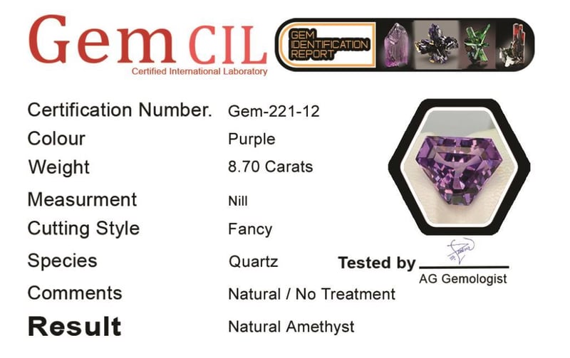 8.70 CARATS NATURAL QUALITY BRAZILIAN AMETHYST 8.70 Carats Natural Quality Brazilian AmethystStone = Natural AmethystWeight = 8.70 CaratsTreatment = Natural Colour = Purple Cut = Fancy Note = Gem Cil, Certified, Precise Custom Cut (Not Commercial) Condition: Good 0+112