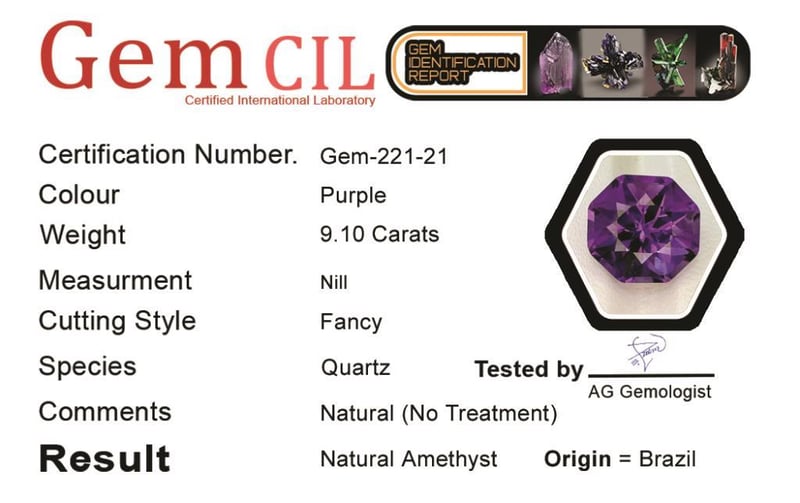 9.10 CARATS NATURAL QUALITY BRAZILIAN AMETHYST 9.10 Carats Natural Quality Brazilian AmethystStone = Natural AmethystWeight = 9.10 CaratsTreatment = Natural Colour = Purple Cut = Fancy Note = Gem Cil, Certified, Precise Custom Cut (Not Commercial) Condition: Good 0+121
