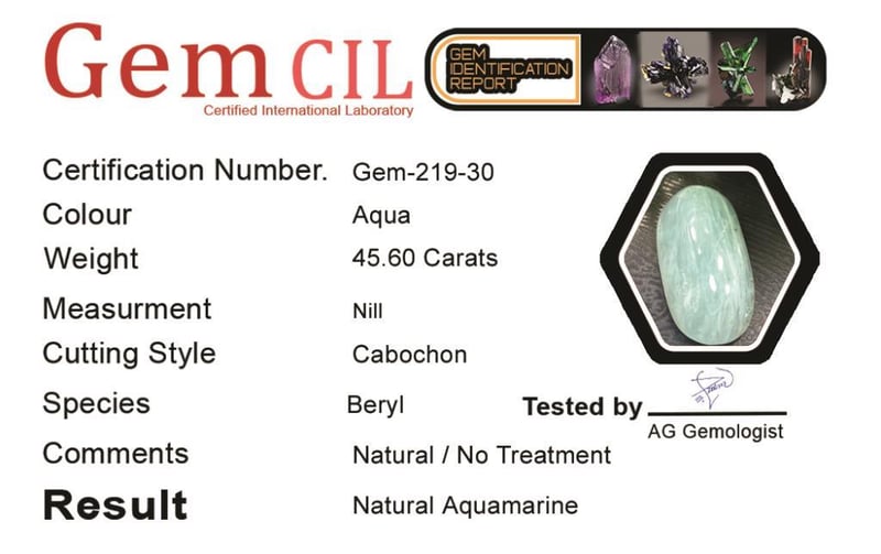45.60 CARATS NATURAL AQUAMARINE 45.60 Carats Natural Aquamarine Stone = Natural Aquamarine Weight = 45.60 Carats Colour = Aqua Cut = Cabochon Note = Gem Cil, Certified Precise Custom Cut (Not Commercial) Condition: Good 645399+30