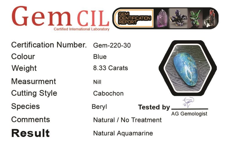 8.33 CARATS NATURAL AQUAMARINE 8.33 Carats Natural Aquamarine Stone = Natural Aquamarine Weight = 8.33 Carats Colour = Blue Cut = Cabochon Note = Gem Cil, Certified Precise Custom Cut (Not Commercial) Condition: Good 0 +80