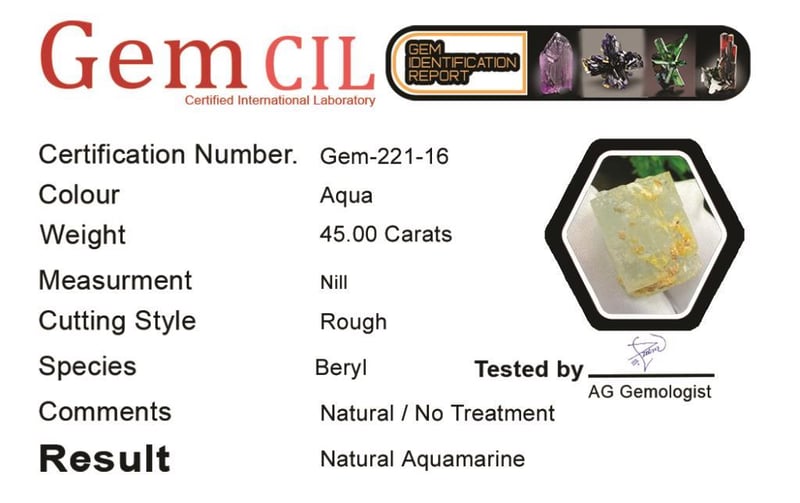 45.00 CARATS NATURAL AQUAMARINE SPECIMEN 45.00 Carats Natural Aquamarine SpecimenStone = Natural Aquamarine SpecimenWeight = 45.00 CaratsColour = AquaCut = Rough Note = Gem Cil, Certified, Condition: Good 0+116