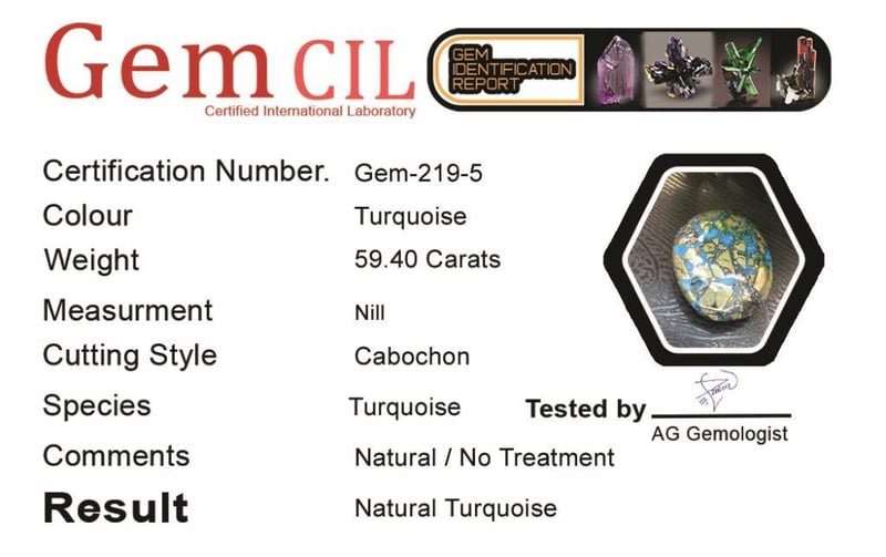 59.40 CARATS NATURAL QUALITY TURQUOISE 59.40 Carats Natural Quality Turquoise Stone = Natural TurquoiseWeight = 59.40 Carats Cut = Cabochon Colour = TurquoiseQuantity = 1Note = Gem Cil, Certified, Condition: Good645399+5