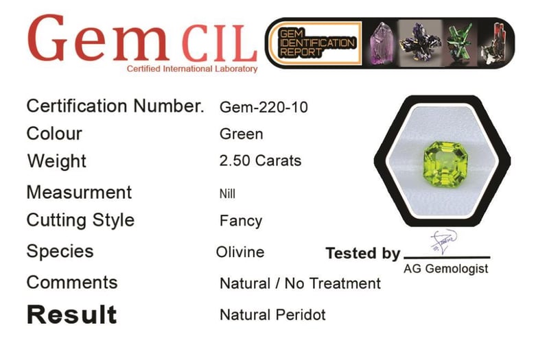 2.50 CARATS NATURAL LUSTROUS PERIDOT 2.50 Carats Natural Lustrous PeridotStone = Natural PeridotWeight = 2.50 CaratsColour = Green Cut = Fancy Quality = (Premium)Note = Gem Cil, Certified, Precise Custom Cut (Not Commercial) Condition: Good 0+60
