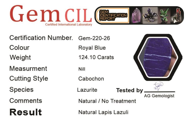 124.10 CARATS NATURAL ROYAL BLUE LAPIS LAZULI 124.10 Carats Natural Royal Blue Lapis Lazuli Stone = Natural Royal Blue Lapis LazuliWeight = 124.10 CaratsTreatment = Natural (Not Dyed) Cut = Cabochon Note = Gem Cil, Certified, Condition: Good 0+76
