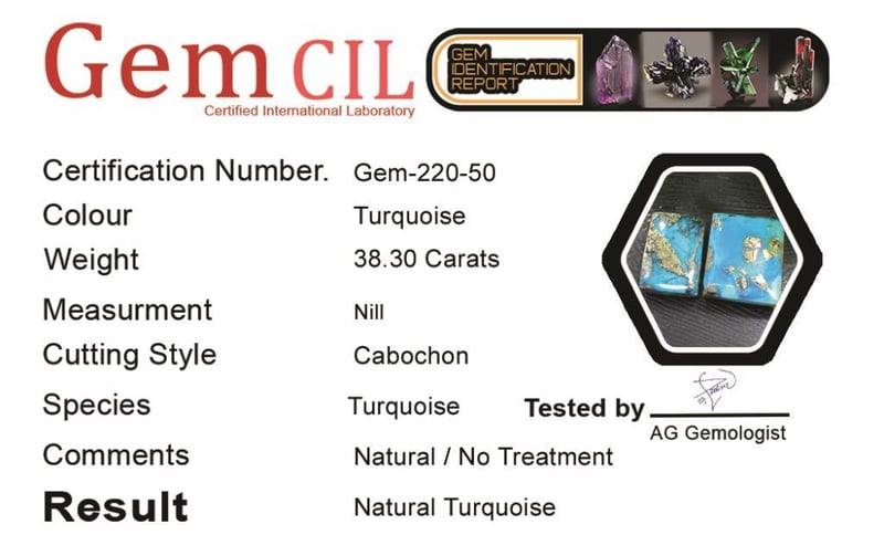 38.30 CARATS NATURAL QUALITY TURQUOISE 38.30 Carats Natural Quality Turquoise Stone = Natural TurquoiseWeight = 38.30 Carats Cut = Cabochon Colour = TurquoiseQuantity = 1Note = Gem Cil, Certified, Condition: Good 0+100