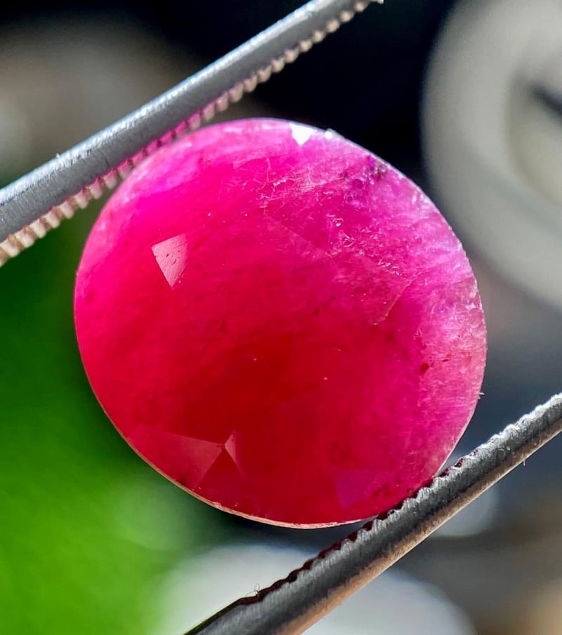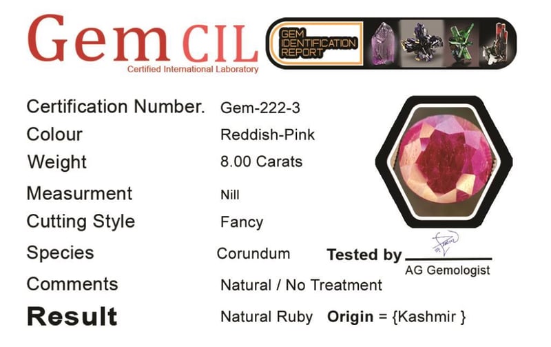 8.00 CARATS NATURAL KASHMIR RUBY 8.00 Carats Natural Kashmir RubyStone = RubyWeight = 8.00 CaratsTreatment = Natural-No Treatment Colour = Reddish-PinkCut = FancyLustre = ExcellentOrigin = Kashmir Note = Gem Cil, Certified, Precise Custom Cut (Not Commercial) Condition: Good - Refer Images 0488335+3
