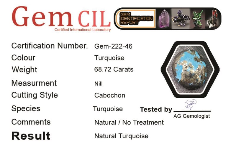 68.72 CARATS NATURAL QUALITY TURQUOISE 68.72 Carats Natural Quality Turquoise Stone = Natural TurquoiseWeight = 68.72 Carats Cut = Cabochon Colour = TurquoiseQuantity = 1Note = Gem Cil, Certified, Condition: Good - Refer Images 0488335+46