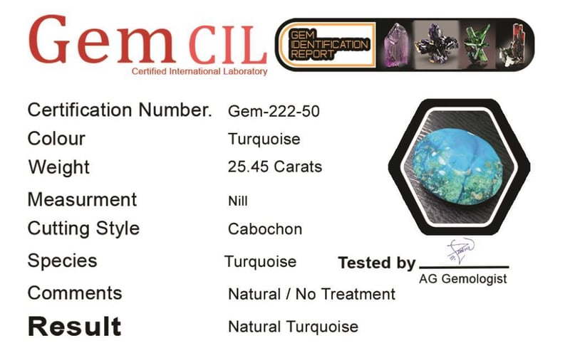 25.45 CARATS NATURAL QUALITY TURQUOISE 25.45 Carats Natural Quality Turquoise Stone = Natural TurquoiseWeight = 25.45 Carats Cut = Cabochon Colour = TurquoiseQuantity = 1Note = Gem Cil, Certified, Condition: Good - Refer Images 0488335+50