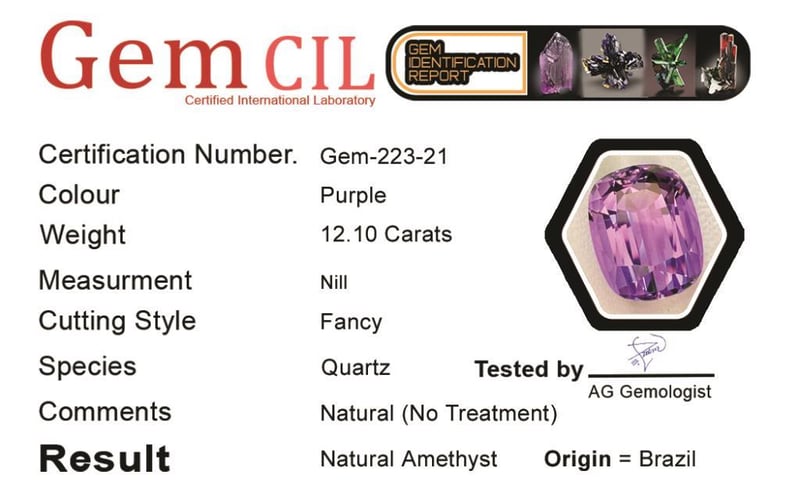 12.10 CARATS NATURAL QUALITY BRAZILIAN AMETHYST 12.10 Carats Natural Quality Brazilian AmethystStone = Natural AmethystWeight = 12.10 CaratsTreatment = Natural Colour = Purple Cut = Fancy Note = Gem Cil, Certified, Precise Custom Cut (Not Commercial) Condition: Good - Refer Images 0488336+21