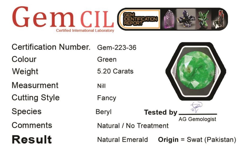 5.20 CARATS NATURAL GREEN EMERALD 5.20 Carats Natural Green Emerald Stone = Natural EmeraldWeight = 5.20 Carats Colour = Green Cut = Fancy Lustre = Excellent Origin = Swat (Pakistan)Note = Precise Custom Cut (Not Commercial) Condition: Good - Refer Images 0488336+36