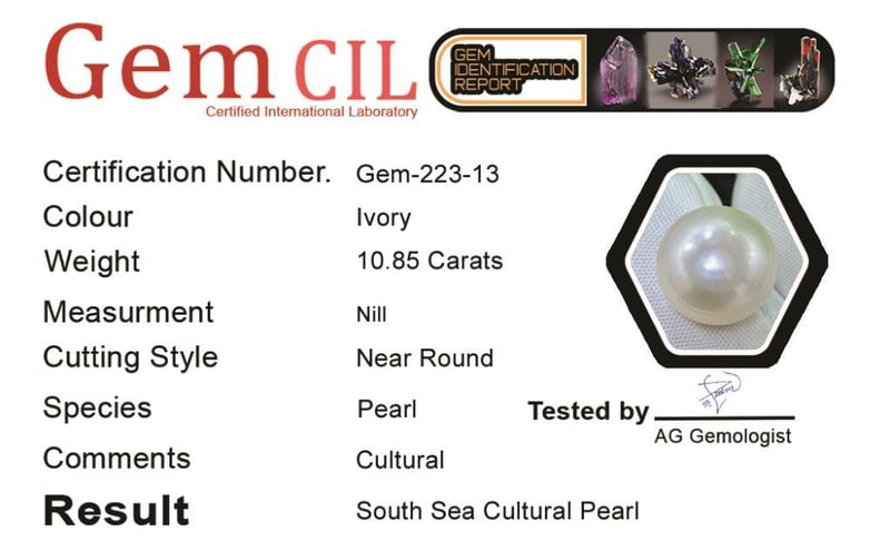 10.85 CARATS SOUTH SEA PEARL 10.85 Carats South Sea Pearl Stone = South Sea Pearl Weight = 10.85 Carats Colour = IvoryTreatment = CulturalNote = Gem Cil, Certified, Condition: Good - Refer Images 0488336+13