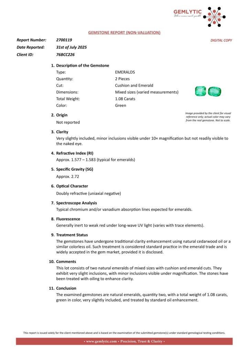 Conclusion: The Examined Gemstones Are Natural Emeralds, Quantity Two, With A Total Weight Of 1.08 Carats, Green In Color, Very Slightly Included, And Treated By Standard Oil Enhancement.