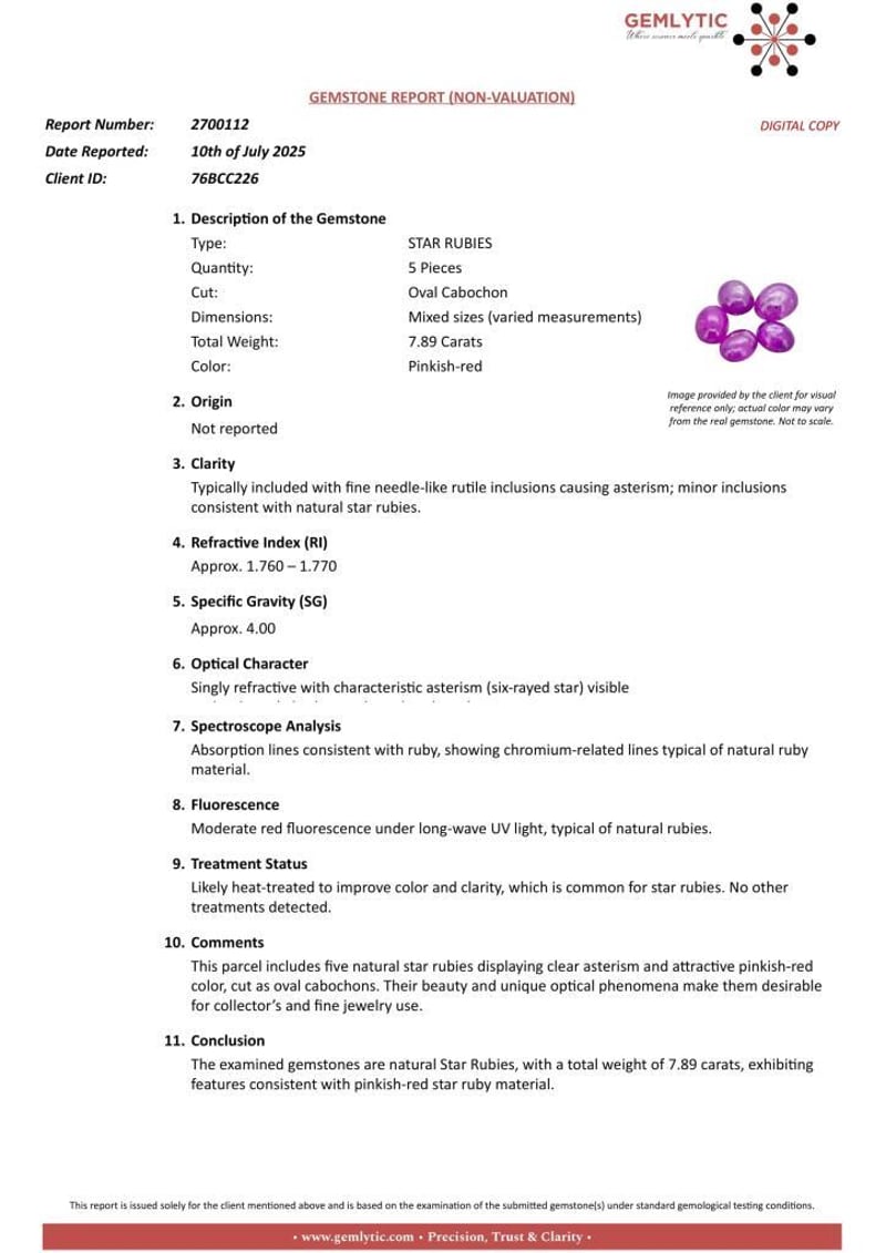 Conclusion: The Examined Gemstones Are Natural Star Rubies, With A Total Weight Of 7.89 Carats, Exhibiting Features Consistent With Pinkish-Red Star Ruby Material.