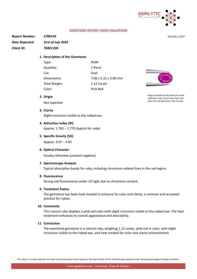 RUBY - 1.12 CARATS - PINK RED Quantity: 1 PcsReport Number: 2700142Clarity: Slight Inclusions Visible To The Naked Eye.Measurements: 7.06 X 5.15 X 3.00Treatments: The Gemstone Has Been Heat Treated To Enhance Its Color And Clarity, A Common And Accepted Practice For Rubies.Origin: Not ReportedRefractive Index: Approx. 1.762 – 1.770 (Typical For Ruby)Specific Gravity: Approx. 3.97 – 4.05Spectroscope Analysis: Typical Absorption Bands For Ruby, Including Chromium-Related Lines In The Red Region.Fluorescence: Strong Red Fluorescence Under Uv Light Due To Chromium Content.Comments: This Natural Ruby Displays A Pink-Red Color With Slight Inclusions Visible To The Naked Eye. The Heat Treatment Enhances Its Overall Appearance And Desirability.Conclusion: The Examined Gemstone Is A Natural Ruby, Weighing 1.12 Carats, Pink-Red In Color, With Slight Inclusions Visible To The Naked Eye, And Heat Treated For Color And Clarity Enhancement. 0+38