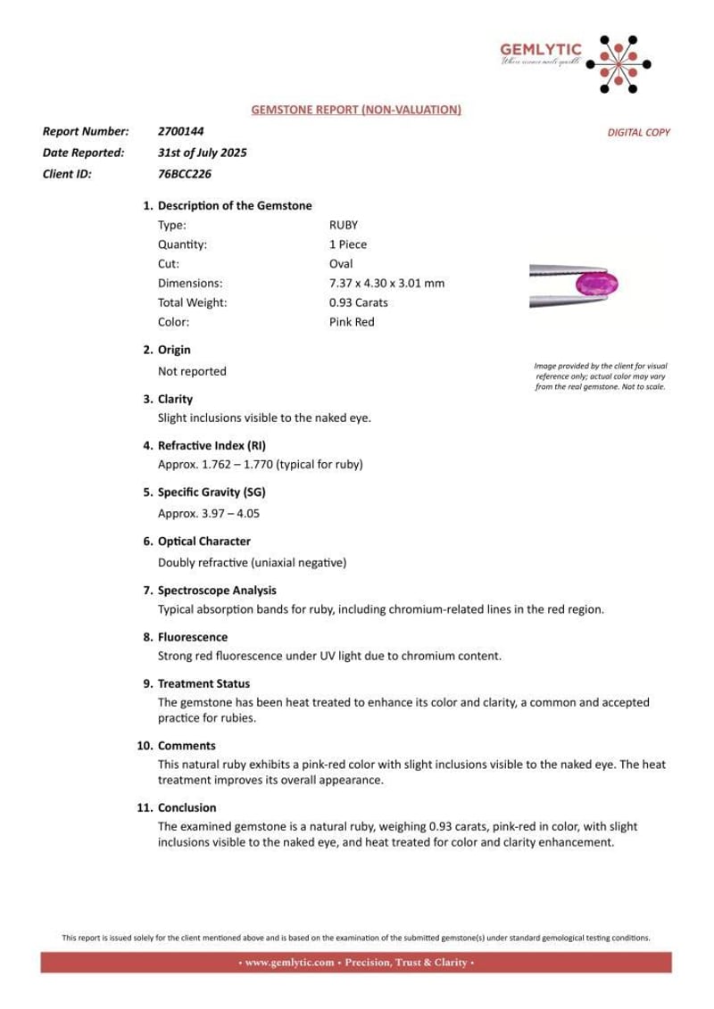 Conclusion: The Examined Gemstone Is A Natural Ruby, Weighing 0.93 Carats, Pink-Red In Color, With Slight Inclusions Visible To The Naked Eye, And Heat Treated For Color And Clarity Enhancement.