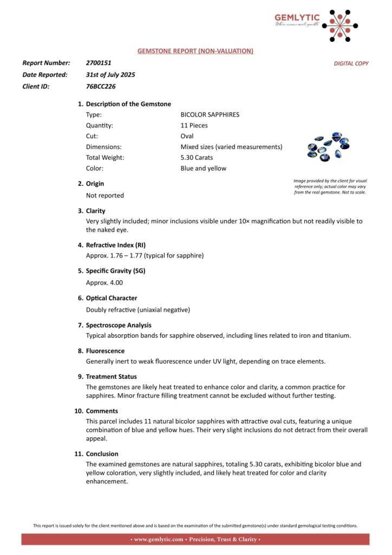 Conclusion: The Examined Gemstones Are Natural Sapphires, Totaling 5.30 Carats, Exhibiting Bicolor Blue And Yellow Coloration, Very Slightly Included, And Likely Heat Treated For Color And Clarity Enhancement.