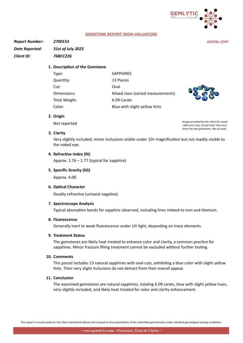 Conclusion: The Examined Gemstones Are Natural Sapphires, Totaling 6.09 Carats, Blue With Slight Yellow Hues, Very Slightly Included, And Likely Heat Treated For Color And Clarity Enhancement.