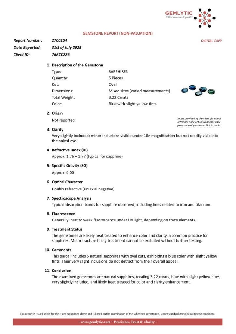 Conclusion: The Examined Gemstones Are Natural Sapphires, Totaling 3.22 Carats, Blue With Slight Yellow Hues, Very Slightly Included, And Likely Heat Treated For Color And Clarity Enhancement.