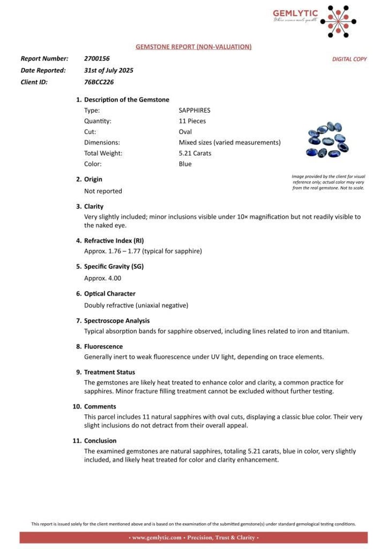 Conclusion: The Examined Gemstones Are Natural Sapphires, Totaling 5.21 Carats, Blue In Color, Very Slightly Included, And Likely Heat Treated For Color And Clarity Enhancement.